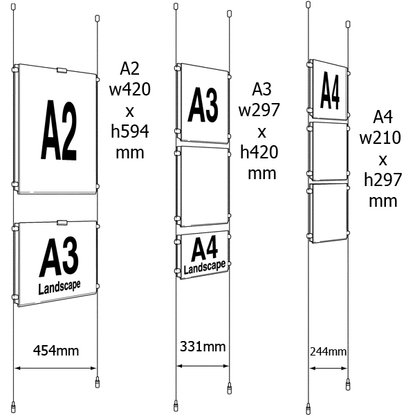 Los bolsillos de plástico permiten insertar carteles a doble cara y están disponibles en tres tamaños diferentes tanto en vertical como en horizontal.