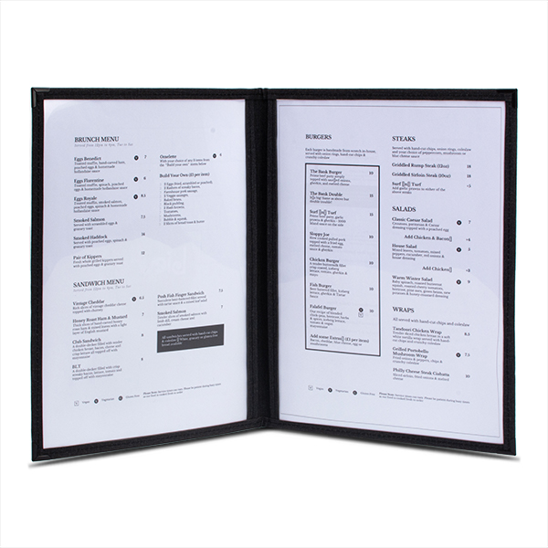 Información sobre la entregaCada porta menú AMERICAN ELITE Doble muestra 4 páginas. Esta nueva línea cuenta con un PVC de alta calidad y unos bordes de tela hechos a mano.