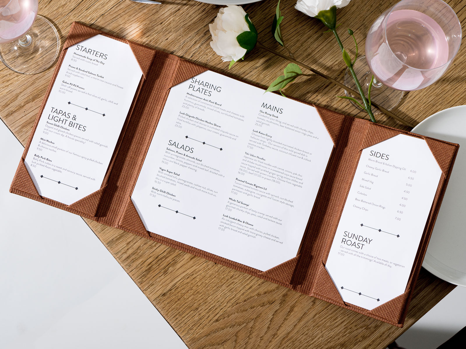 Nuestro estampado en lámina dorada y la combinación de colores savana crean un aspecto atemporal para cualquier logotipo y menú.