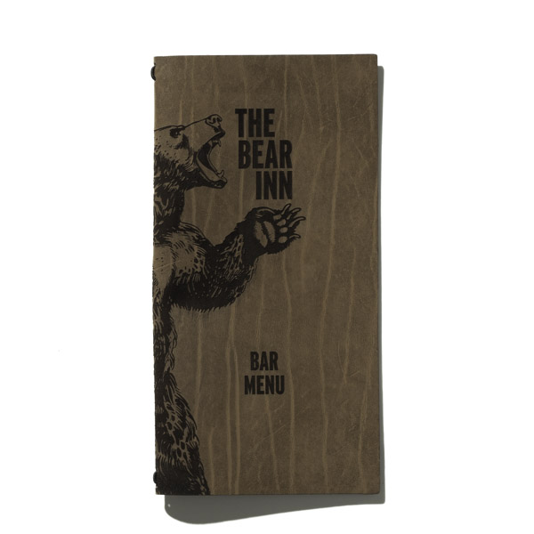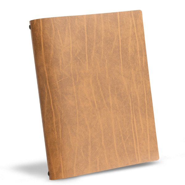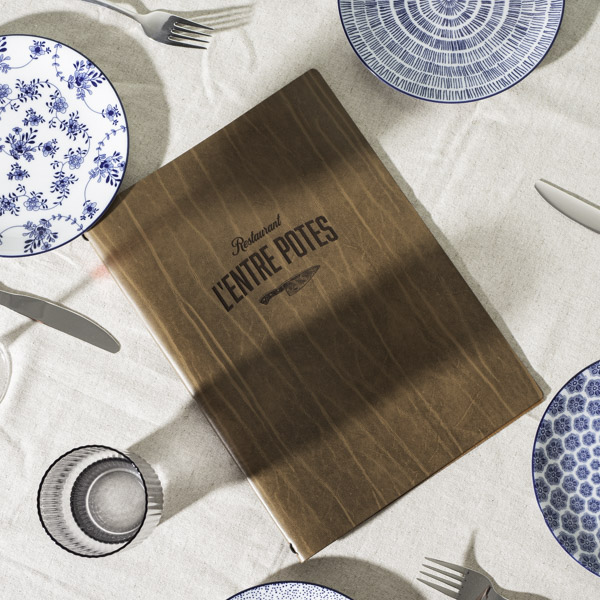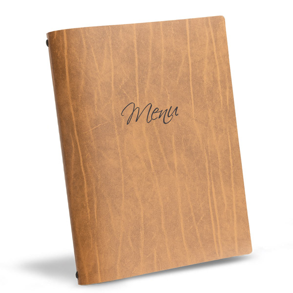 Porta menú de piel reciclada con una textura natural, material duradero y acabado flexible.