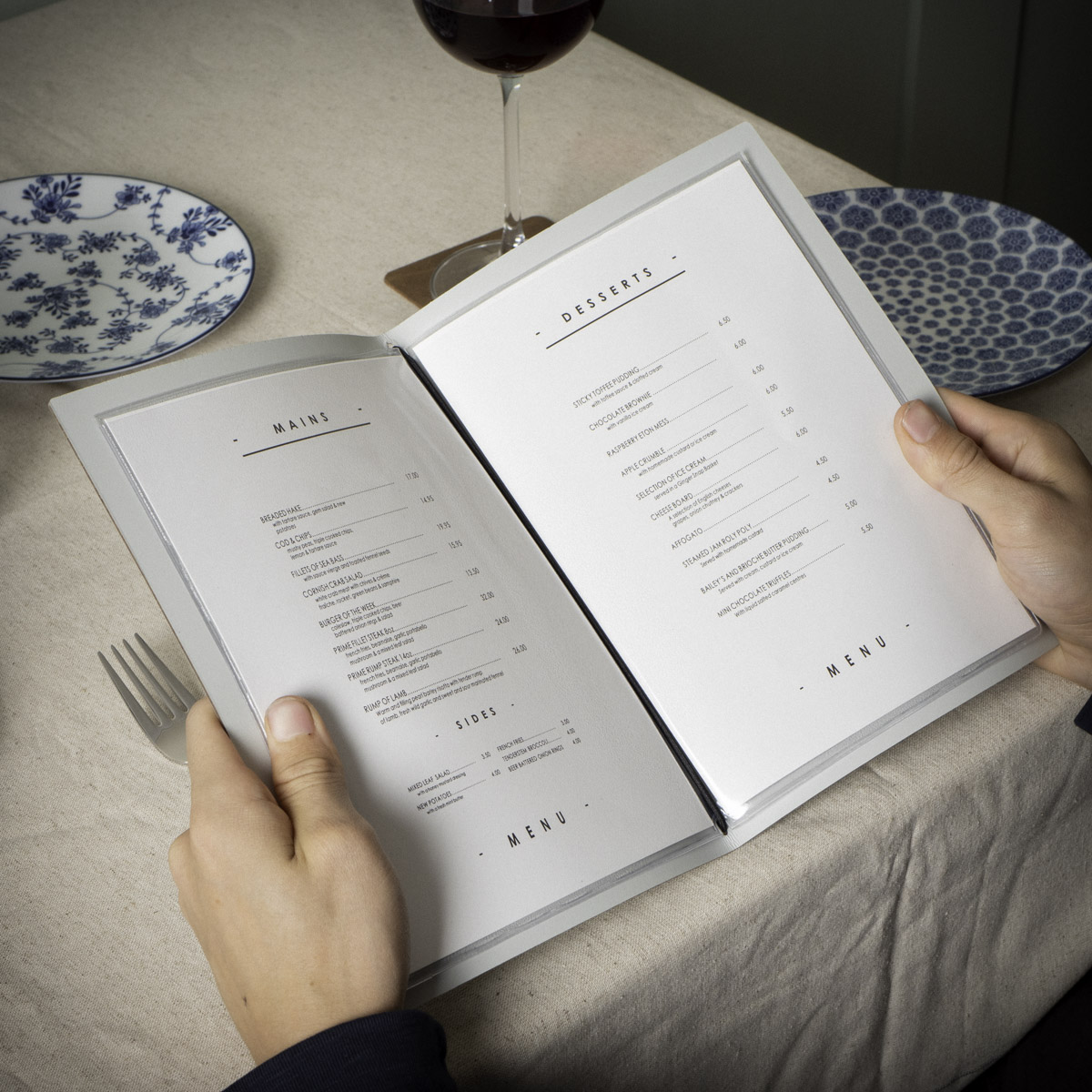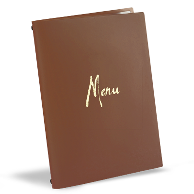 Son cartas de menú de tapa blanda con un acabado de textura suave que podrá personalizar mediante termograbado o estampado en varios colores.