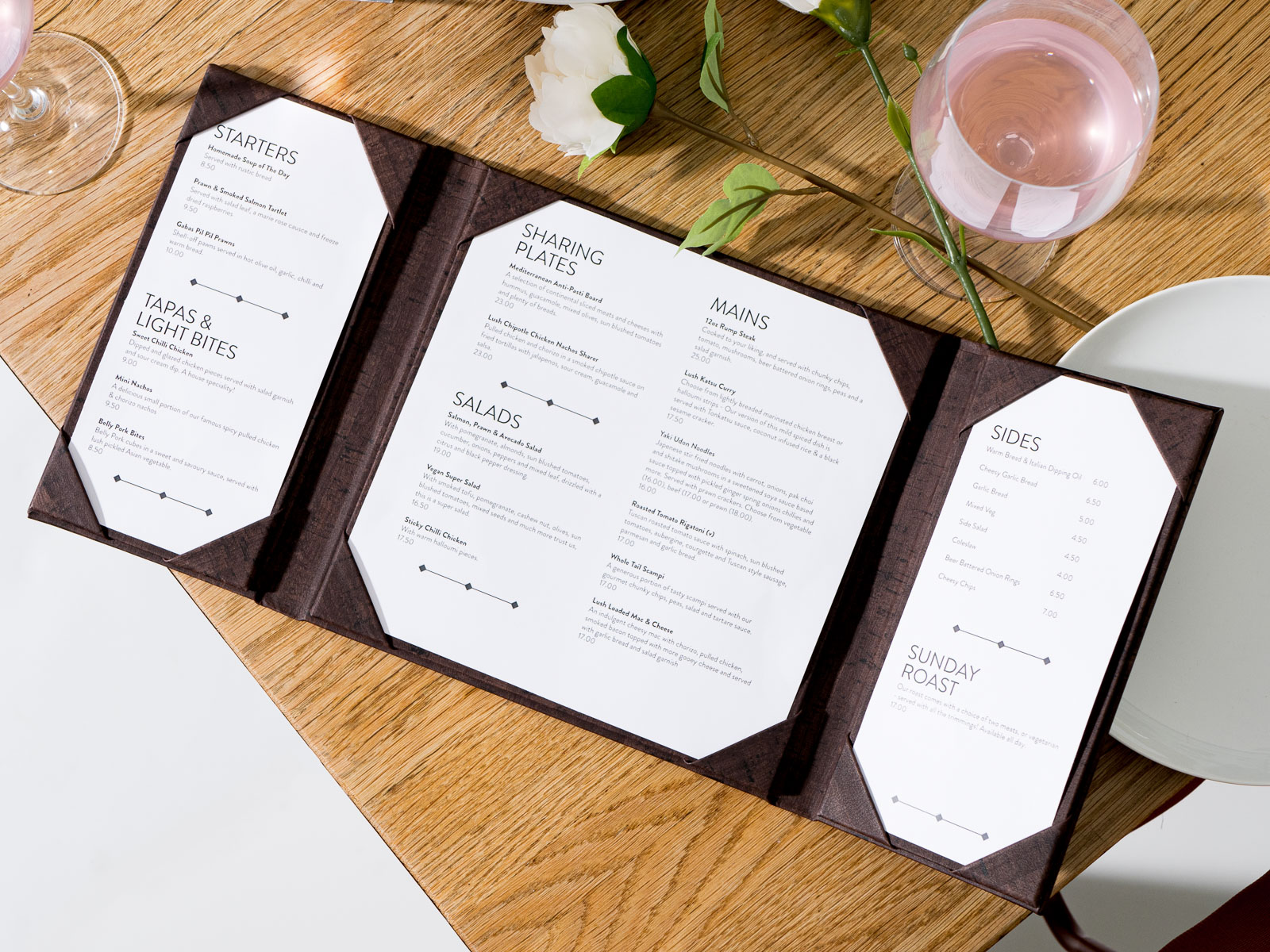 Nuestros porta menús de estilo desplegable son ideales para presentaciones compactas de menús cortos. Muestra hasta 3 páginas de información en una carpeta con apertura central e interiores de funda de solapa.