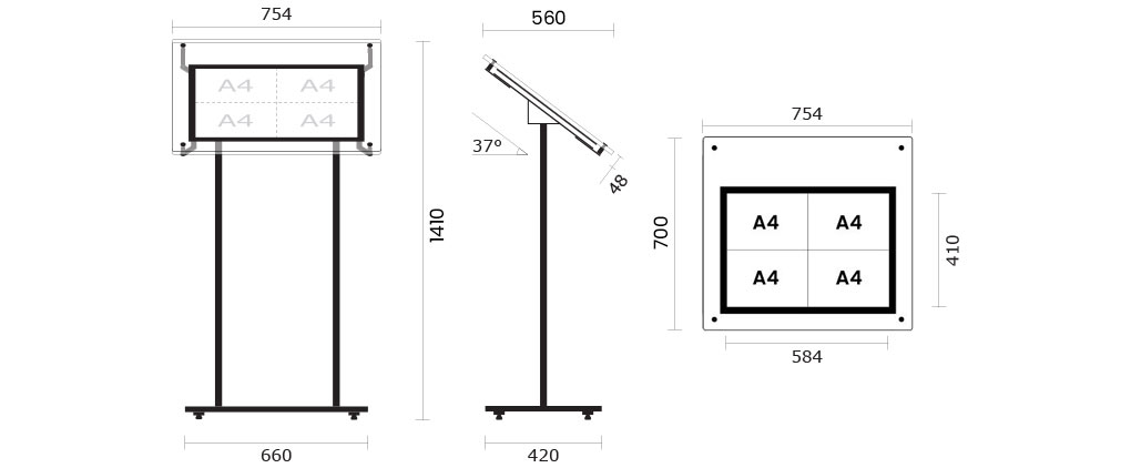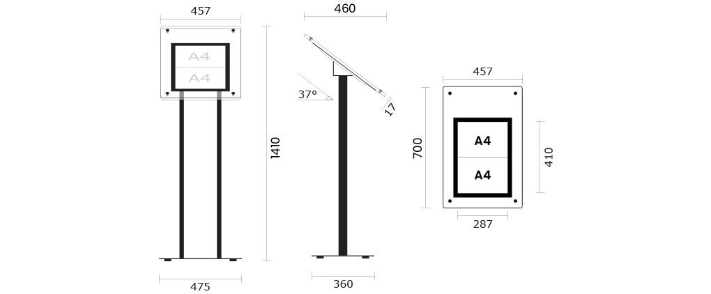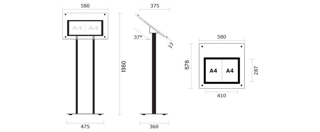 Puede elegir entre los tamaños A2 y A3 que a su vez están disponibles en modo horizontal y vertical con unas robustas fijaciones a pared en color negro.