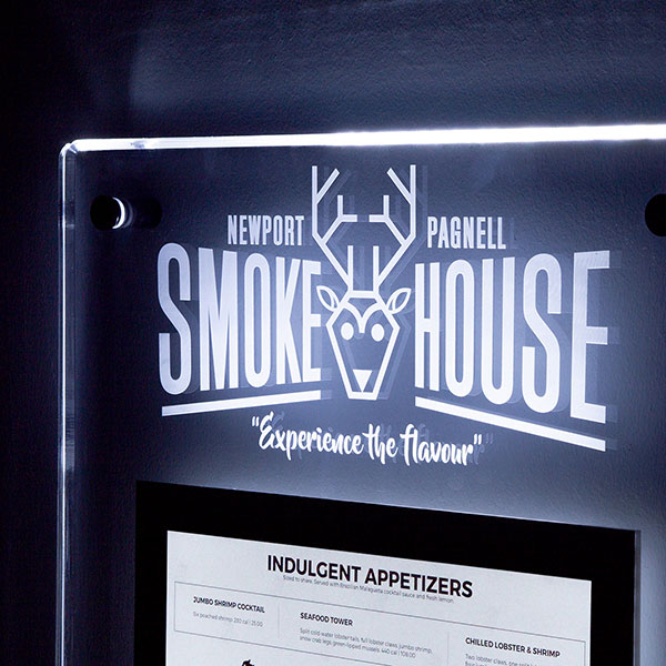 Impactante expositor de menús de metacrilato con retroiluminación y una zona para grabar su logotipo.