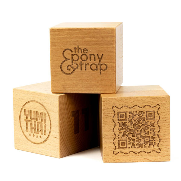Cubos de madera grabados con infinidad de posibilidades: menús con código QR, números de mesa y letreros de “reservado”.
