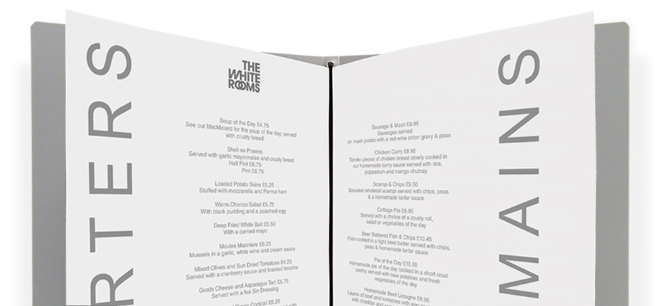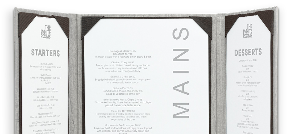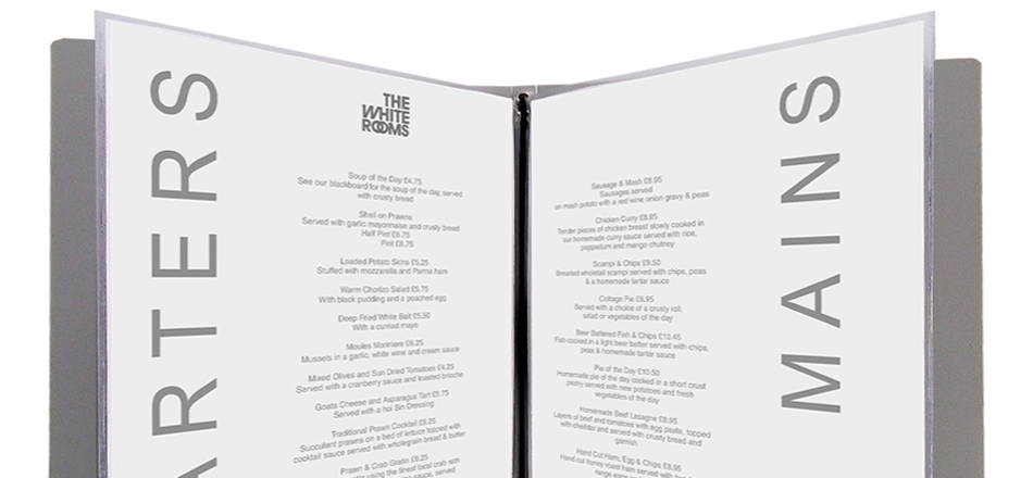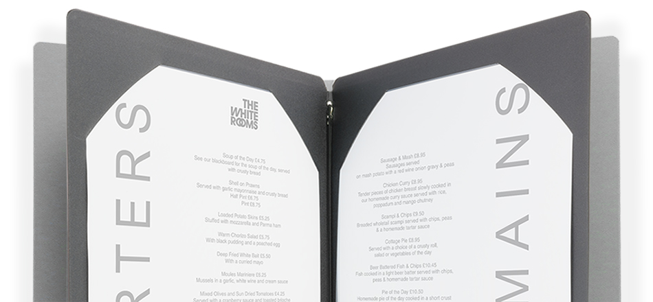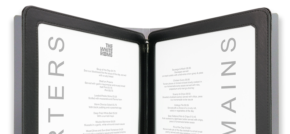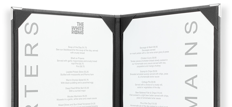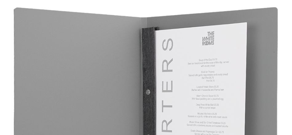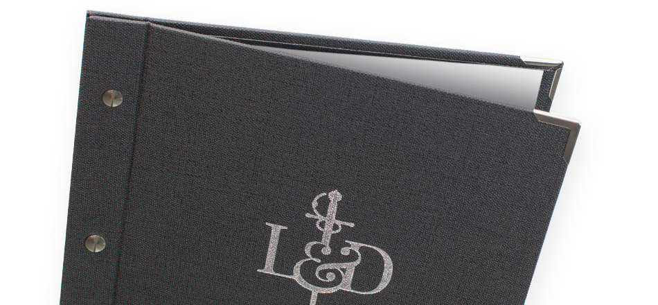 Las páginas de su menú se sujetan mediante solapas fijadas a la cubierta de su portamenús y protegidas mediante una lámina de plástico.