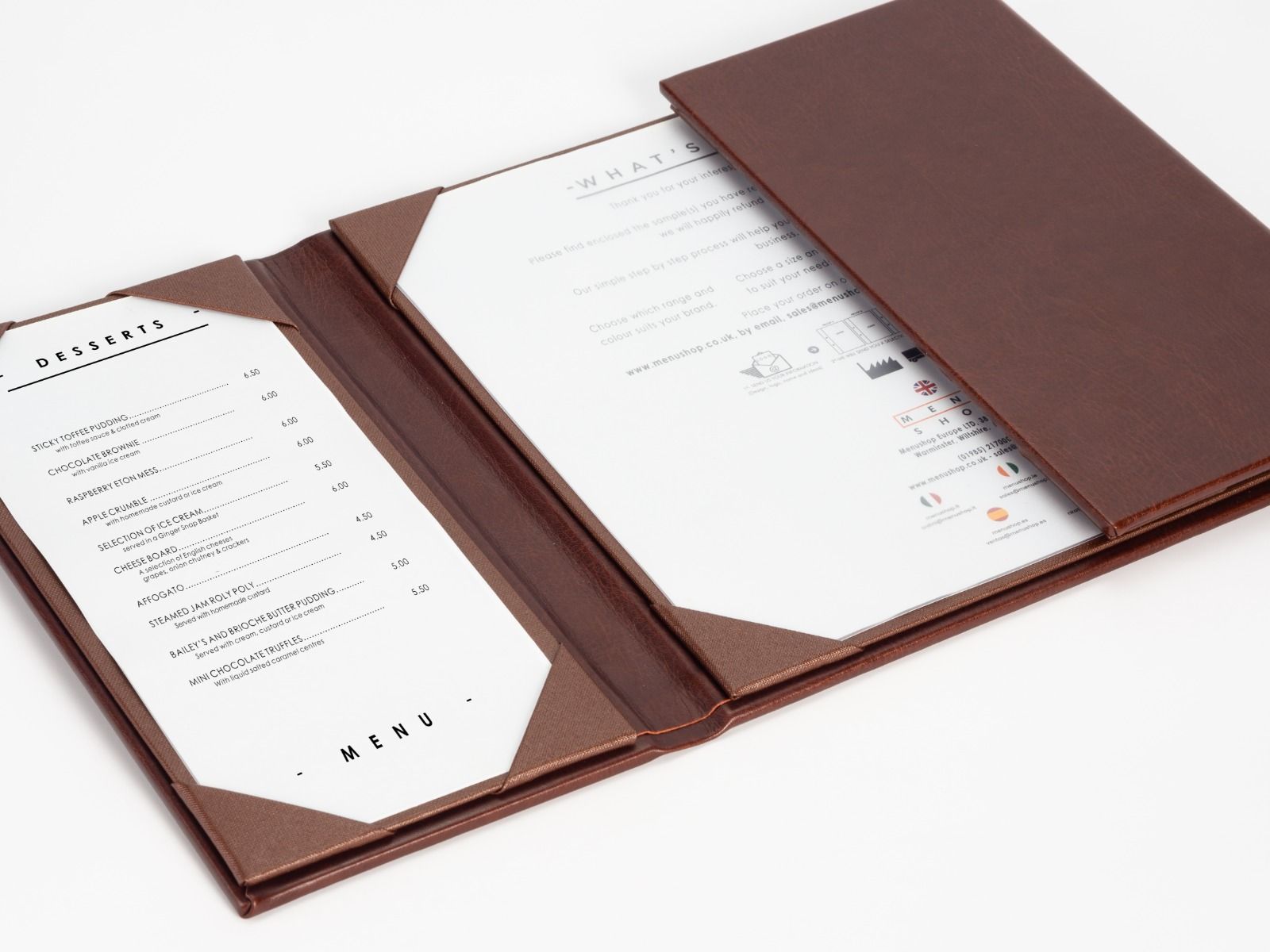 Nuestros porta menús de estilo desplegable son perfectos para presentaciones compactas de menús cortos. Muestra hasta 3 páginas de información en una carpeta de apertura central con interiores de funda de solapa.