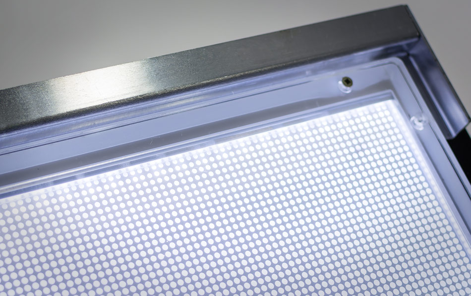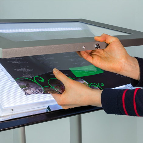 Nuestros expositores cuentan con un panel retroiluminado LED ultrabrillante y duradero que proporciona una visibilidad fantástica para su información. Tiene una vida útil de aproximadamente 50 000 horas. Vienen con un transformador para convertir la fuente de alimentación a bajo voltaje; como alternativa, ofrecemos una fuente de alimentación por batería opcional.