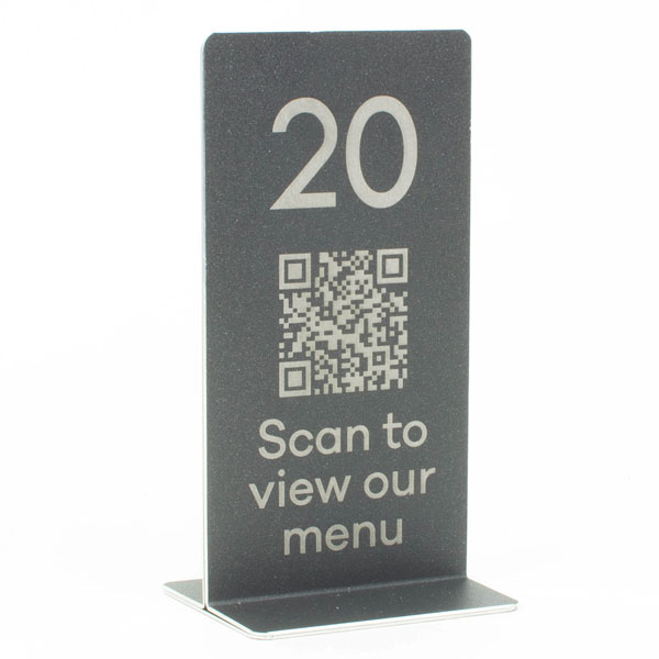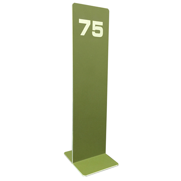 Número de mesa vertical en aluminio. Disponible en 7 colores. Personalización mediante grabado.
