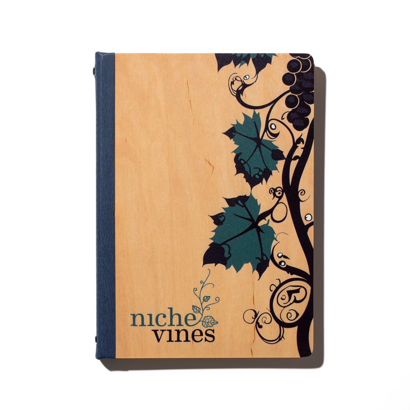 Estos impresionantes menús de madera están disponibles en un acabado de madera natural clara u oscura y en tres tamaños diferentes.