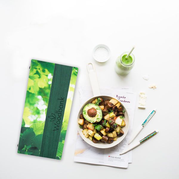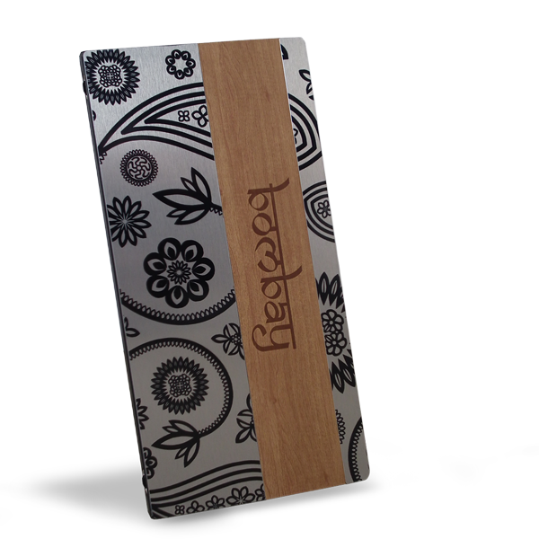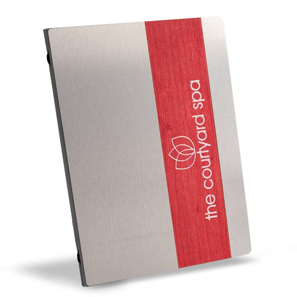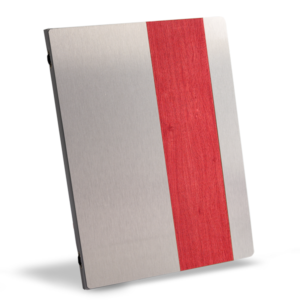 Portamenús metálico en 3 colores con acabado pulido combinados con banda de madera sintética personalizable