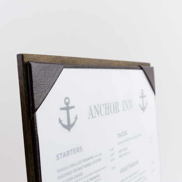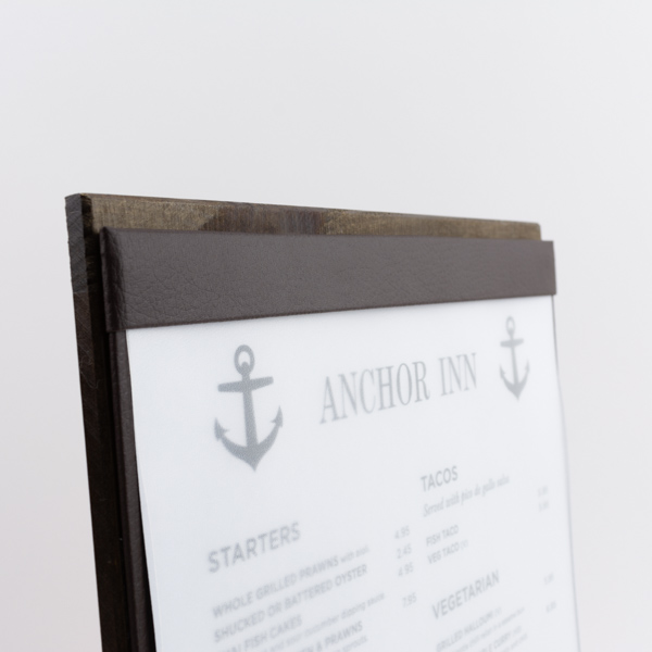 Información sobre la entregaNuestra gama de productos Oporto ahora también está disponible en tablas de menú. Están fabricadas utilizando una gruesa tabla de madera con solapas de cuero, pinza metálica o banda superior e inferior para sujetar la hoja de su menú.