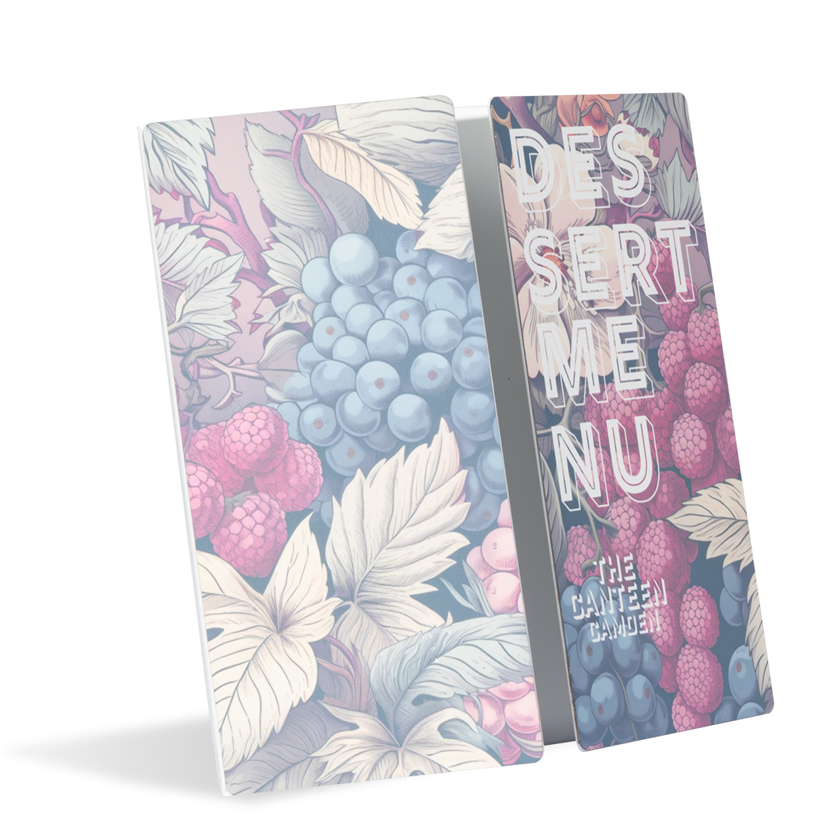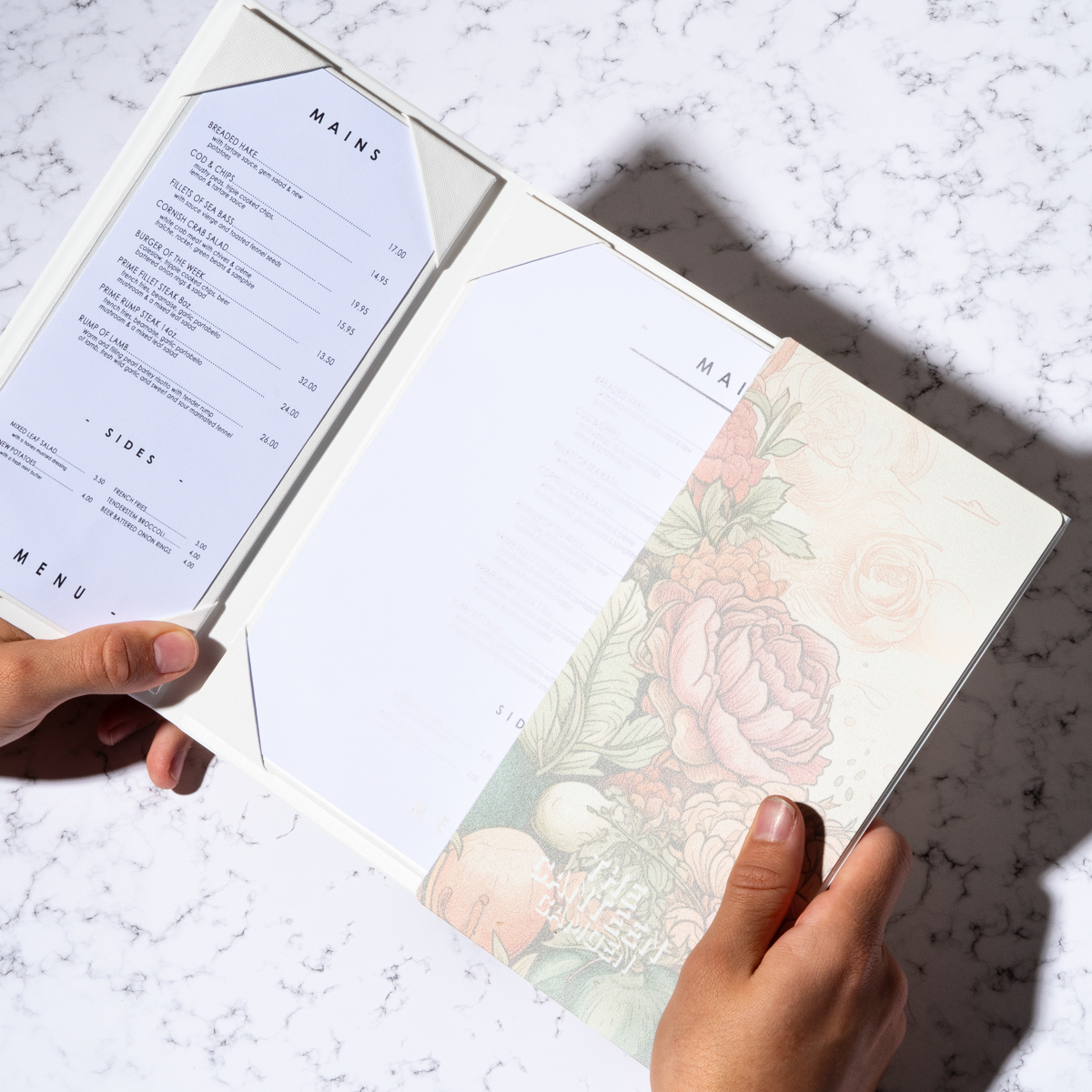 Nuestros portamenús de estilo desplegable son perfectos para presentaciones compactas de menús cortos. Muestra hasta tres páginas de información en una carpeta de apertura central con interiores de fundas de solapa.