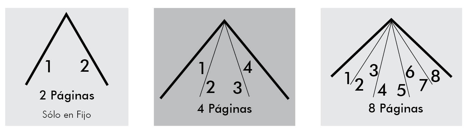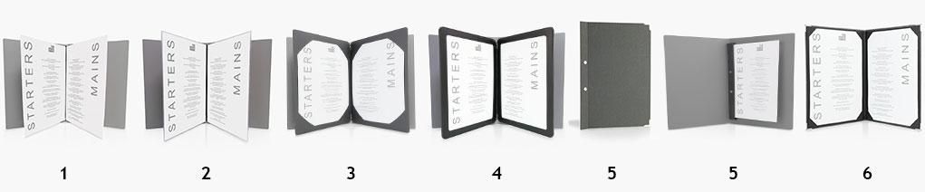 6. Fijo: Las páginas de su menú se sujetan mediante solapas fijadas a la cubierta de su portamenús y protegidas mediante una lámina de plástico. Esta opción le permite mostrar sólo 2 páginas.