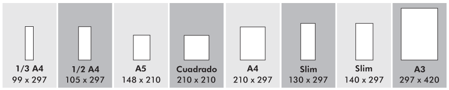 Organizamos los menús en categorías según el tamaño del papel que pueden portar, así que el tamaño real del portamenús siempre será algo mayor. La mayoría de los menús están disponibles en tres tamaños diferentes.